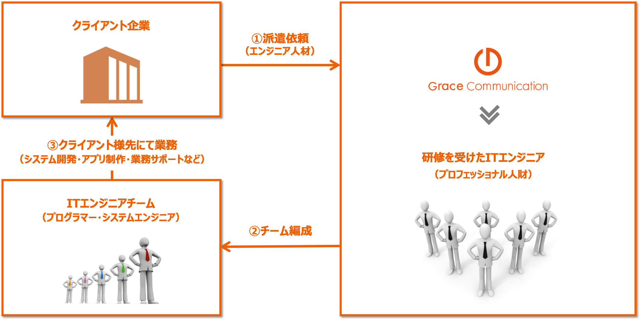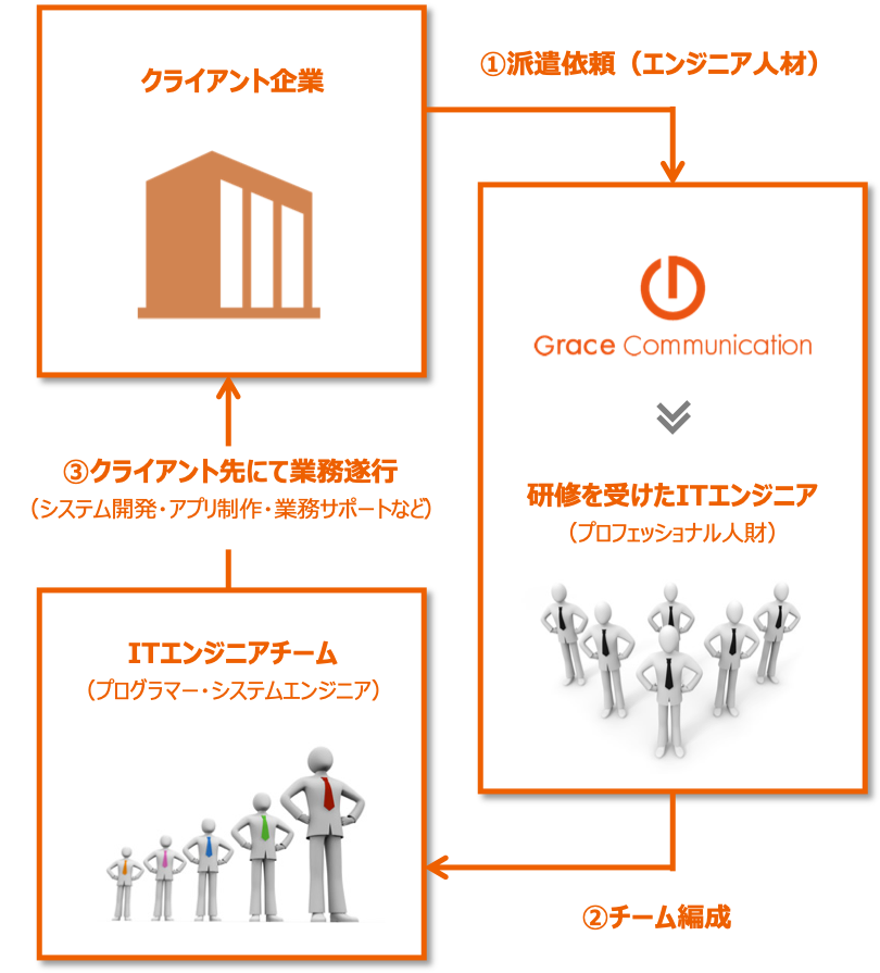 クライアント企業内でのエンジニア人材の人手不足を解消するために、当社では、IT関連知識・スキルを適切な社内教育によって身に付けたプロフェッショナル人財をご提供しています。まずは達成したいゴール(システム開発の完成型など)や、達成に向けてIT人材をどのように登用されたいか?などをヒアリングさせていただき、必要スキルを保有した人材・バックアップチームを編成いたします。また、当社でその業務サポートを行うチームや、ヘルプデスクなどを追加で編成し、全面的な開発支援を行うことも可能となります。