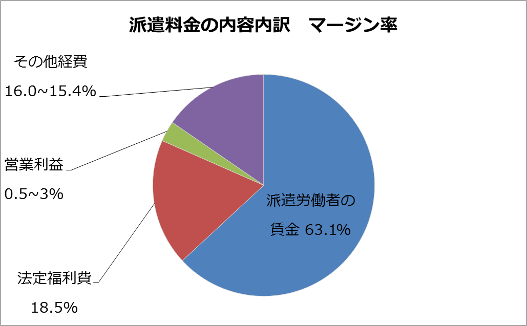 派遣先より当社に支払われる額(派遣料金)から、派遣スタッフに支払う額(賃金)を差し引いた残りがマージンであり、これを派遣料金で除いたものがマージン率となります。
