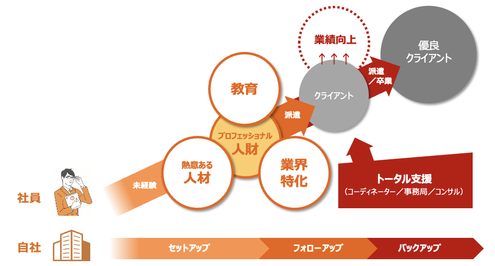 当社管理下の人材はこれまでの業務経験を活かし常に一つ上のステップを目指し、成長を続けております。