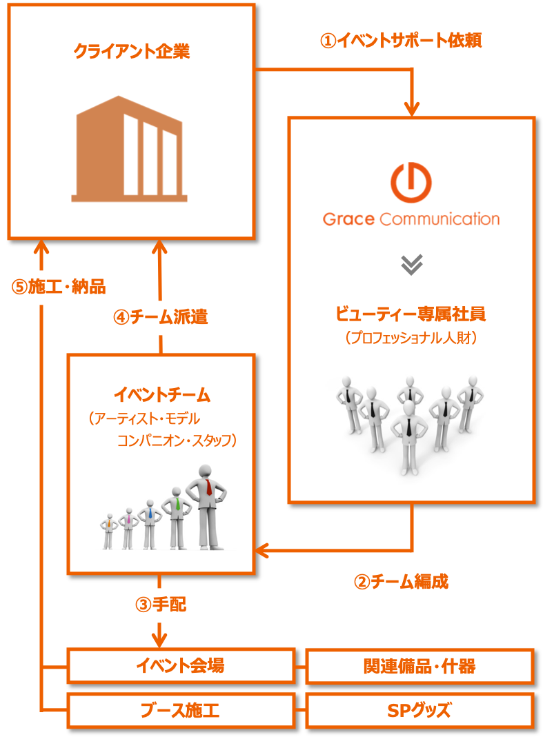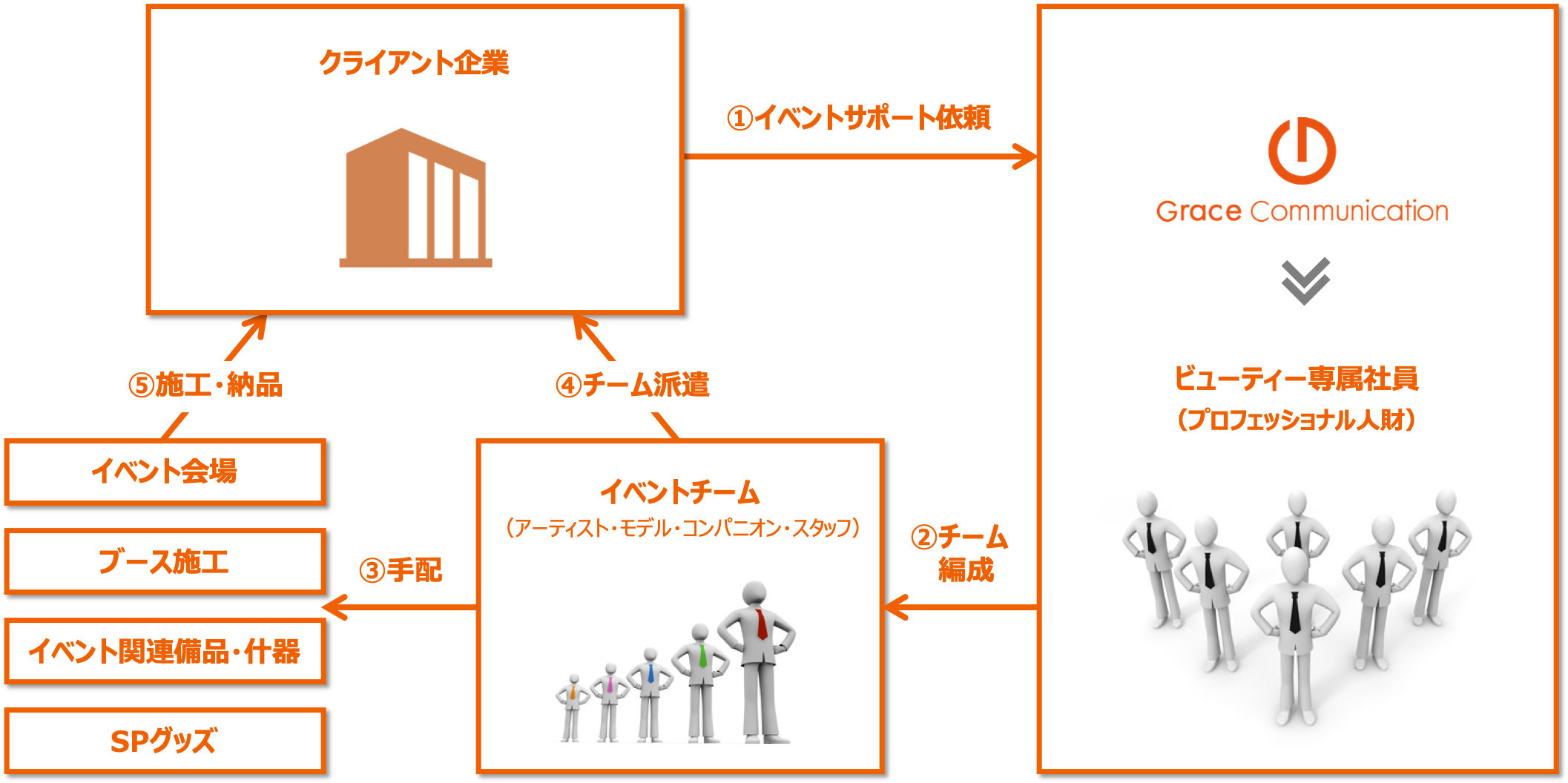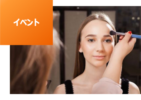 化粧品ブランドのクライアントでは、販売促進を目的としたイベント開催を全面バックアップするケースがあります。ただ人材を派遣するだけでなく、開催目的などを総合的にヒアリングした上で、イベント会場のリサーチ・手配、会場を作り上げる施工会社の段取り、必要となる各種什器や備品・SPグッズなどを当社が一括で受託し、開催に至るまでトータルにサポートいたします。また、イベントの運営においても、プロのメイクアップアーティストや、メイクモデル、コンパニオンなど、会場を盛り上げるスタッフも一括手配し、イベントを通じてクライアントが達成したいゴールに向けて伴走いたします。